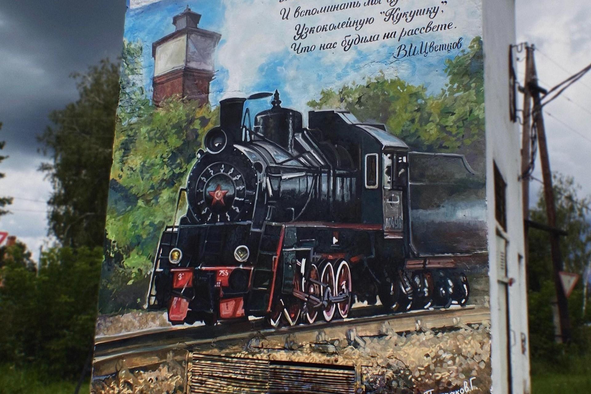 Картина на трансформаторной подстанции — художник закончил мурал в честь тумской узкоколейкиВсю работу Глеб Петраков выполнил кистями, чтобы получилась настоящая картина
